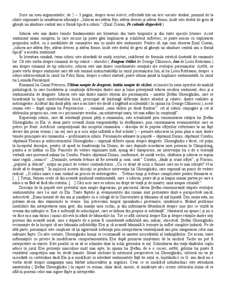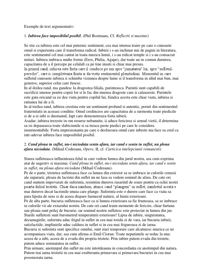Eminescu opere tasteaza in coltul stang dupa acel b alb pe fond rosu titlul de mai sus si te va conduce catre un alt model de text argumentativ de unde ai putea sa mai aduni cateva idei pentru textul tau argumentativ. Eseu argumentativ tip sii română dacă sunteți în căutarea unui eseu legat de un subiect anume și nu l găsiți aici lăsați mi un mesaj și se rezolvă ps. Atât de multe motive are un bărbat să i citească sufletul să i vrea inima şi să i sărute corpul. Iubirea are atâtea feţe atâtea devieri şi atâtea forme încât este destul de greu să găseşti un sâmbure central sau o formă tipică a iubirii emil cioran pe culmile disperării iubirea este una dintre temele fundamentale ale literaturii din toate timpurile şi din toate epocile literare.
