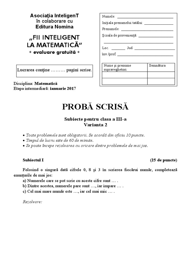 Subiectul i 20 de puncte calculează. Concursul fii inteligent in matematică subiecte si bareme calarasi cls ii iv alte concursuri ediţia 2012. Ianuarie 2017 probă scrisă subiecte pentru clasa a iii a varianta 3 toate problemele sunt obligatorii. Asociaţia inteligent în colaborare cu editura nomina fii inteligent la matematică evaluare gratuită disciplina.