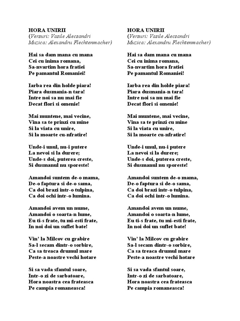 Hora unirii de vasile alecsandri. Amândoi suntem de o mamă de o făptură şi de o seamă ca doi brazi într o tulpină ca doi ochi într o lumină. Versuri hora unirii de vasile alecsandri. Amândoi avem un nume amândoi o soartă n lume. Cu 164 de ani în urmă 9 iunie 1856 scriitorul vasile alecsandri publica în revista steaua dunării condusă de mihail kogălniceanu poezia hora unirii realizată prin refacerea şi lărgirea valorii simbolice a vechii hore a ardealului 1848 poezia pusă pe o melodie de circulaţie în epocă a devenit în scurt timp imnul de luptă pentru unirea principatelor imnul.