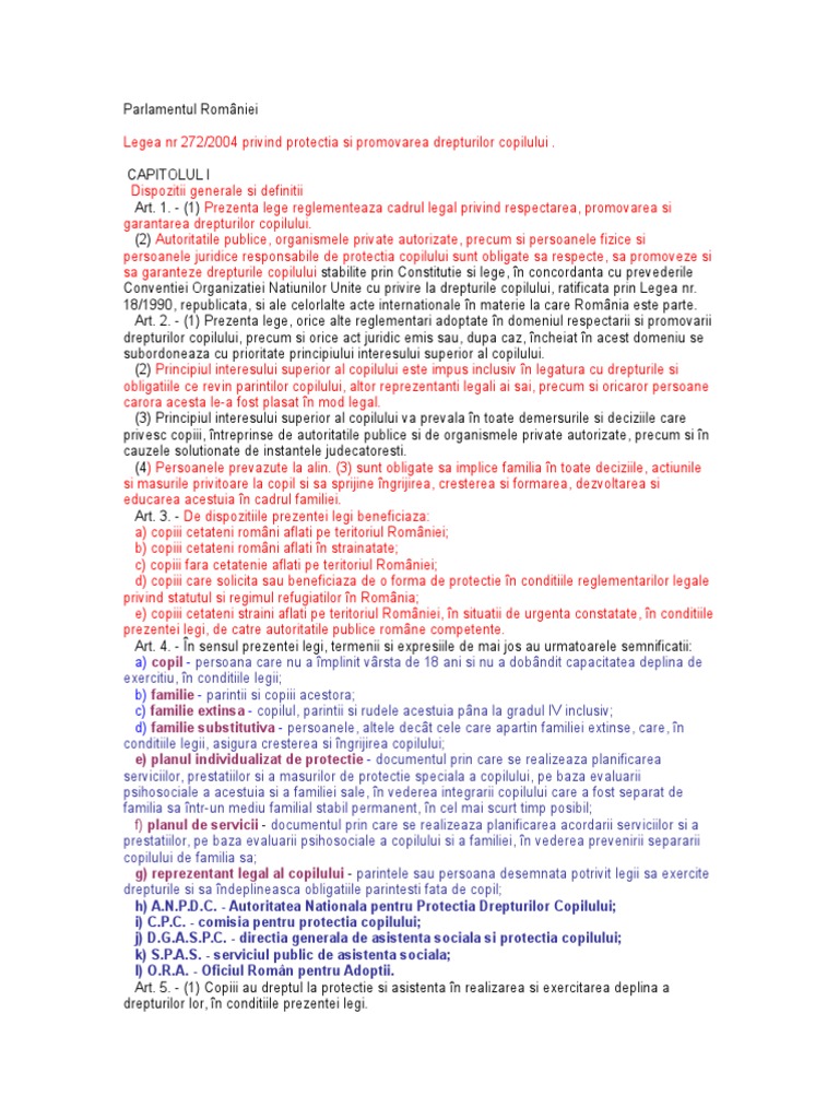 272 2004 privind protectia si promovarea drepturilor copilului republicata si actualizata 2016 act normativ emis de catre organul legislativ al puterii de stat in romania acesta este parlamentul ce cuprinde norme generale de conduita obligatorii si impersonale. 409 din 10 iunie 2011 rectificata in monitorul oficial al romaniei partea i nr. 557 din 23 iunie 2004 si a mai fost modificata prin legea nr. Legea este inspirată după modelul canadian model care a fost luat în seamă și cu ocazia redactării noului cod civil al româniei.