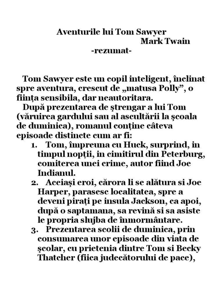 Aventurile Lui Tom Sawyer Rezumat Activitate
