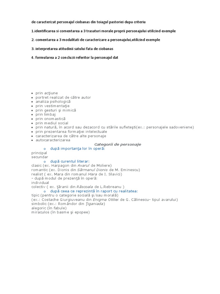 Modalitati de caracterizare a personajelor. Prin natură în acord sau dezacord cu stările sufleteşti ex. Personajul literar este eroul care strabate continutul unui text. Curentul şi genul literar în care poate fi încadrată opera. De către personajul însuşi autocaracterizare.