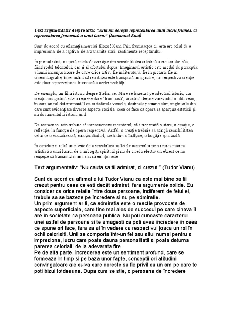 August 12 2016 victoria. 3667084 arta este un lucru esential intr un colectiv pentru ca le permite artisitlor sa isi dezvolte pasiune indiferent de natura lor le da posibilitatea de a creea un univers al lor asa ca prin acestea modul de viata este cu mult imbunatatit prin expunerea operelor artistilor in public ceilalti oameni percep mesajul transmis fiecare in felul lui. Rolul artei in plan social. La simularea din anul 2014 elevii de clasa a xi de la profilul uman au primit cerința de a redacta un text argumentativ.