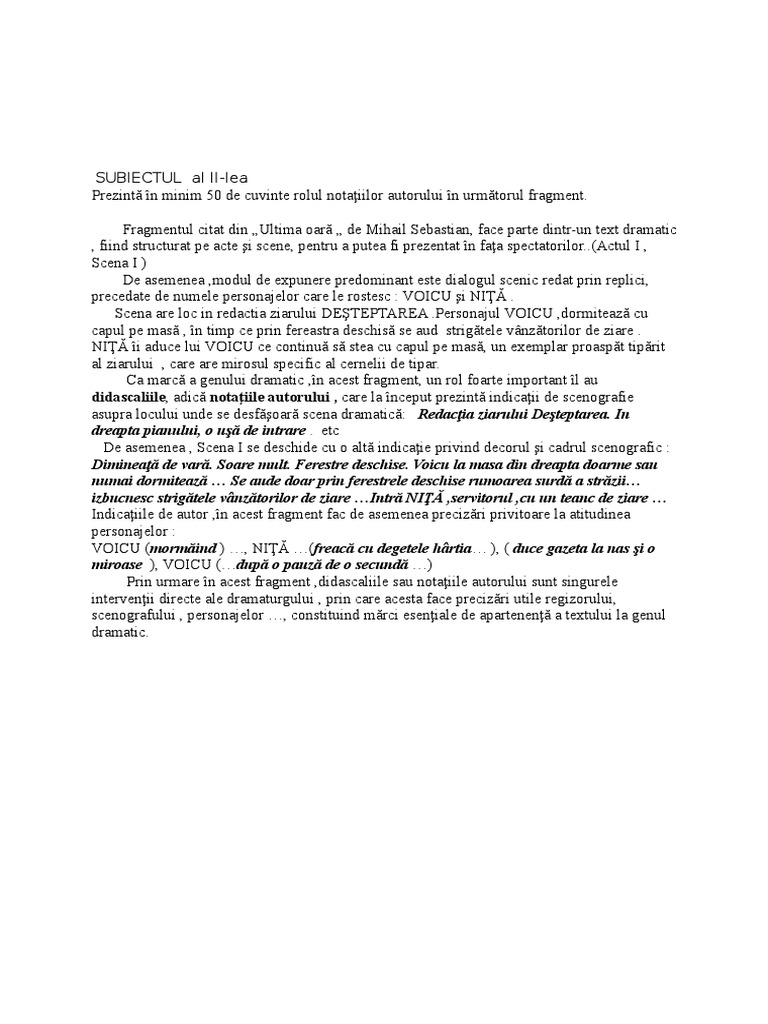 Rolul indicațiilor scenice indicațiile scenice sau didascaliile cuvânt provenit din grecescul didaskalia termen ce desemna caietele cu însemnări primite de către actori înaintea unei reprezentații sunt instrucțiunile autorului unei piese de teatru realizate în vederea unei interpretări corespunzătoare a operei pe scenă. Analiza unui fragment din piesa de teatru ultima oră de mihail sebastian un text despre rolul scriitorilor în societate şi un eseu despre două personaje dintr un roman interbelic studiat au fost subiectele de la bacalaureat proba la limba şi literatura română de la profilul umanist. Comenteaza in 60 100 de cuvinte urmatoarea secventa din text. Prezintă în minimum 50 de cuvinte rolul notațiilor autorului în următorul fragment.